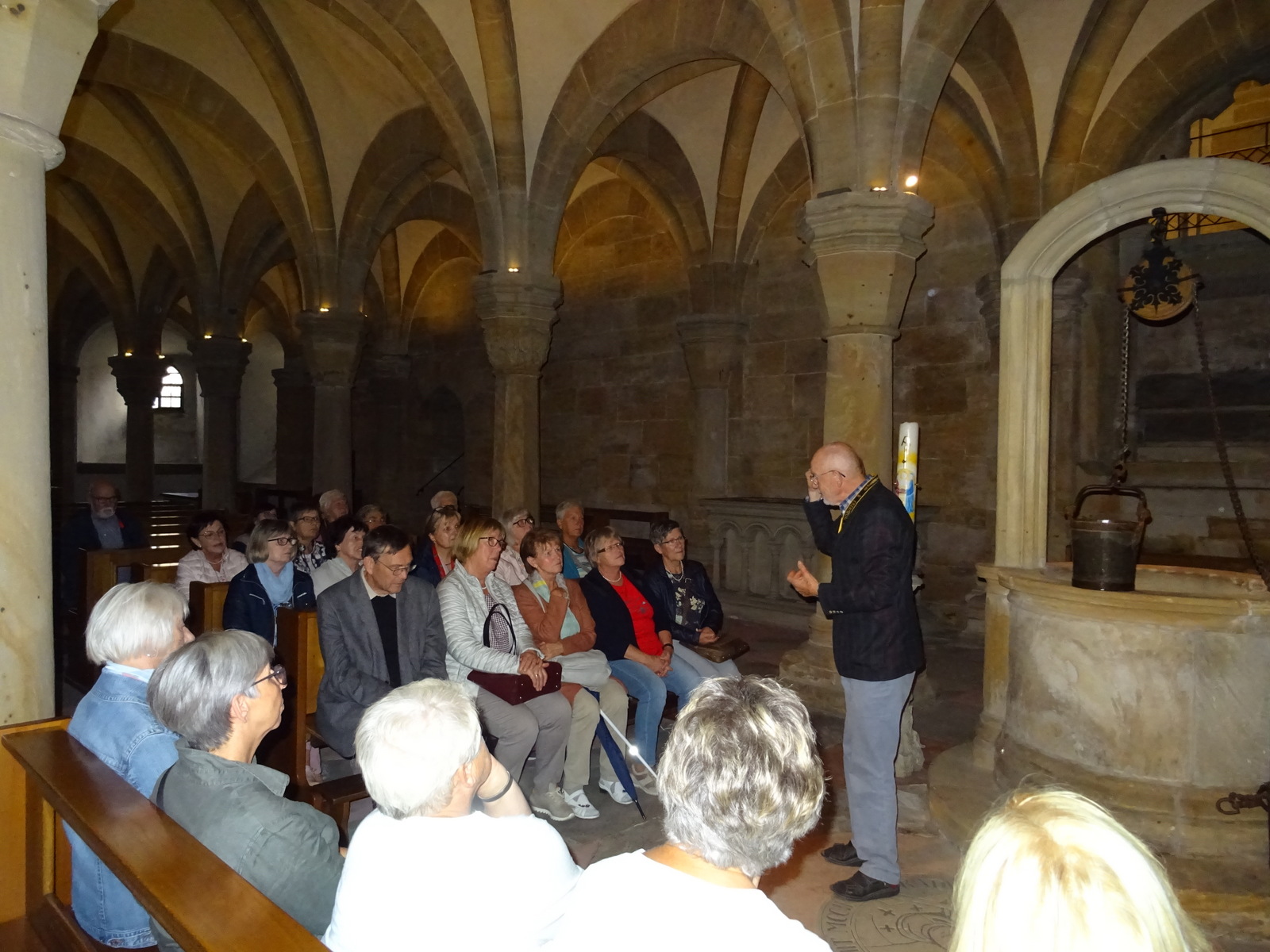 51 ehrenamtliche Mitarbeiterinnen und Mitarbeiter in der Seniorenarbeit des Dekanates waren am Freitag, den 13. September zusammen mit dem Dekanatsaltenseelsorger Pfarrer Christian Grebner und der Dekanatsvorsitzenden Ursula Hohaus auf einem Tagesausflug nach Oberfranken unterwegs. Einen Teil der Buskosten und die Kosten für die Domführung in Bamberg wurden als Dankeschön für die geleistete Arbeit von der Dekanatskasse übernommen. In Forchheim feierten die Teilnehmer mit Pfarrer Grebner einen Gottesdienst in der reich geschmückten Kirche St. Martin. In seiner Predigt bedankte sich Pfarrer Grebner bei den Mitarbeiterinnen und Mitarbeitern für ihre geleistete Arbeit in den Seniorengruppen. Nach dem Gottesdienst vermittelte ein Priesterseminarist interessante Einblicke in die Geschichte und die Ausstattung der Kirche. Pfarrer und Regionaldekan Martin Emge feierte zur gleichen Zeit einen Schulgottesdienst und stieß deshalb erst beim Mittagessen im fränkisch-romantischen Stadtlockal zur Gruppe. Nach einem kurzen Spaziergang durch die Fußgängerzone ging es weiter nach Bamberg. Dort erlebten die Teilnehmer einen spirituellen Gang durch den Dom in zwei Gruppen. An verschiedenen Stationen wie z.B. Taufbrunnen, Bischofsgrablege oder am Kaisergrab von Heinrich II. und Kunigunde wurden biblische Botschaft, Kirchengeschichte und eigene Lebensdeutung in den Blick genommen. Kurze meditative Elemente eröffneten einen Raum für die Auseinandersetzung mit dem eigenen Glauben. Unter den Skulpturen beeindruckte besonders die lebensechte mittelalterliche Reiterplastik „Bamberger Reiter“, bei dem man nicht sicher weiß, wen er darstellt. Nach dem Dombesuch genossen manche Teilnehmer die Abendsonne im Rosengartencafe, während andere einen kurzen Abstecher in die Bamberger Altstadt machten. Auf der Heimfahrt war Gelegenheit, das Erlebte im Gespräch miteinander auszutauschen.
