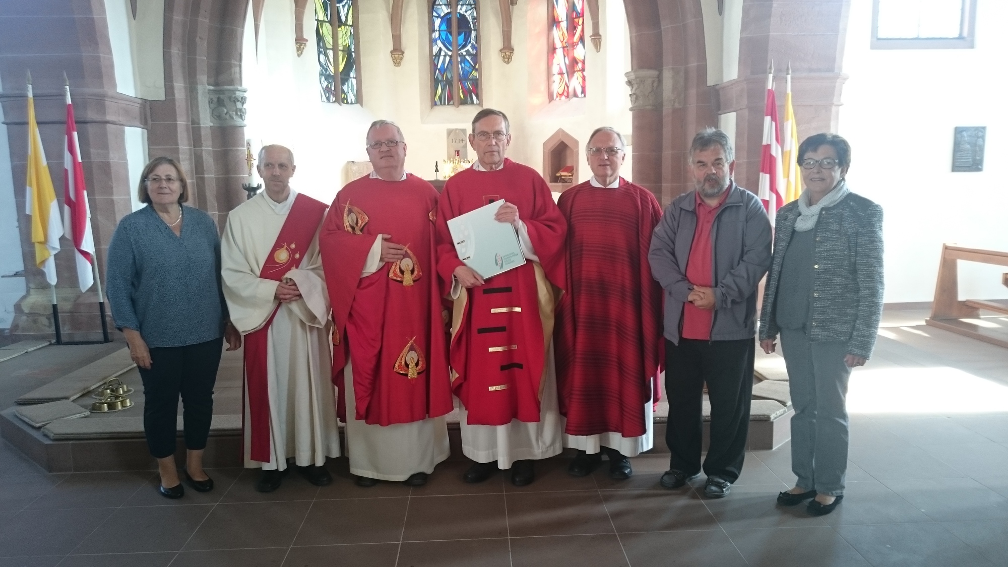 In einem feierlichen Gottesdienst in der Pfarrkirche St. Katharina in Schöllkrippen hat der Diözesanaltenseelsorger Pfr. Franz Schmitt aus Würzburg Pfr. Dr. Christian Grebner in sein neues Amt als Dekanatsaltenseelsorger eingeführt. In Konzelebration feierten Dekan Stefan Eirich und Diakon Helmar Brücker den Gottesdienst mit. Vor ca. 80 Gottesdienstteilnehmenden ging Pfr. Franz Schmitt auf den Oldie von Bob Dylan "Forever young" und die deutsche Version von Wolfgang Ambroß ein. So heißt es im Lied: "Du sollst nie aufhörn zum Lernen, arbeit' mit der Phantasie, wann'st dei Glück gerecht behandelst, dann verlaßt's di nie. Und du sollst vor Liebe brennen, und vor Begeisterung, weil dann bleibst für immer jung." Pfr. Schmitt wünschte allen, die sich in der Seniorenarbeit engagieren und insbesondere dem neuen Dekanatsaltenseelsorger, dass sie in ihrem Dienst vor Liebe brennen und begeistert bleiben mögen und dass sich dies auf alle Senioren auswirken möge." Vor dem Segen gab es eine Reihe von Gratulationen für Pfr. Grebner. Allen voran begrüßte die Dekanatsvorsitzende Ursula Hohaus den neuen Altenseelsorger: "Ich sehe unsere und Ihre Aufgabe vor allem darin, den Mitarbeiterinnen und Mitarbeitern Mut zu machen, sich auf ein Leben einzulassen, dass vom Evangelium geprägt ist und es weiterzugeben an unsere Senioren. Für diese Aufgabe wünschen wir Ihnen die Kraft des heiligen Geistes und Gottes guten Segen." Regionalreferent Volkmar Franz überreichte Grebner einen Ordner des Senioren-Forums für die vielen Papiere, die produziert würden. Aber nicht das Papier oder die Buchstaben seien letztlich wichtig, sondern der konkrete Mensch in den verschiedene Situationen des Alters und Alterns. Dekan Stefan Eirich wies darauf hin, dass Pfr. Grebner noch weitere Ämter neben dem des Pfarrers von Schöllkrippen und Kleinkahl übernommen hätte und wünschte viel Kraft für die neue Aufgabe. Er würdigte die professionelle Arbeit des Senioren-Forums und wünschte weiterhin eine erfolgreiche Seniorenarbeit im Dekanat Alzenau. Auch Bürgermeister Reiner Pistner hatte den Gottesdienst mitgefeiert und lies es sich nicht nehmen, einen Gratulationsgruß an Pfr. Grebner zu richten. Er betonte wie wichtig die Gemeinschaftserfahrung für ältere Menschen sei und lobte den Einsatz des Senioren-Forums mit allen Angeboten, die letztlich der Vereinsamung entgegen wirken würden. Im Anschluss an den Gottesdienst lud das Dekanats-Senioren-Forum zu einem Sektempfang in die "Neue Zeit" ein, in der am Nachmittag dann die Herbstversammlung stattfand.