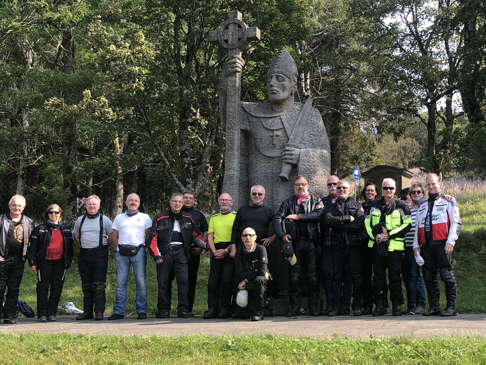 Deshalb war die Fahrt zum „Heiligen Berg der Franken“ zwar die offizielle Abschlussfahrt, aber es wurde weiter gefahren. Wir waren übrigens nicht die einzigen, die an einem Bilderbuch-Wetter-Tag zum Kreuzberg wallten - mit dem Rad, dem Auto oder Motorrad -, und weil überbevölkert, kamen wir auch nicht in die Kirche hinein. So suchten wir einen Platz beim Hl. Kilian (siehe Bild) und ließen uns vom Biker-Diakon Werner Schüßler wieder „in-spirieren“: