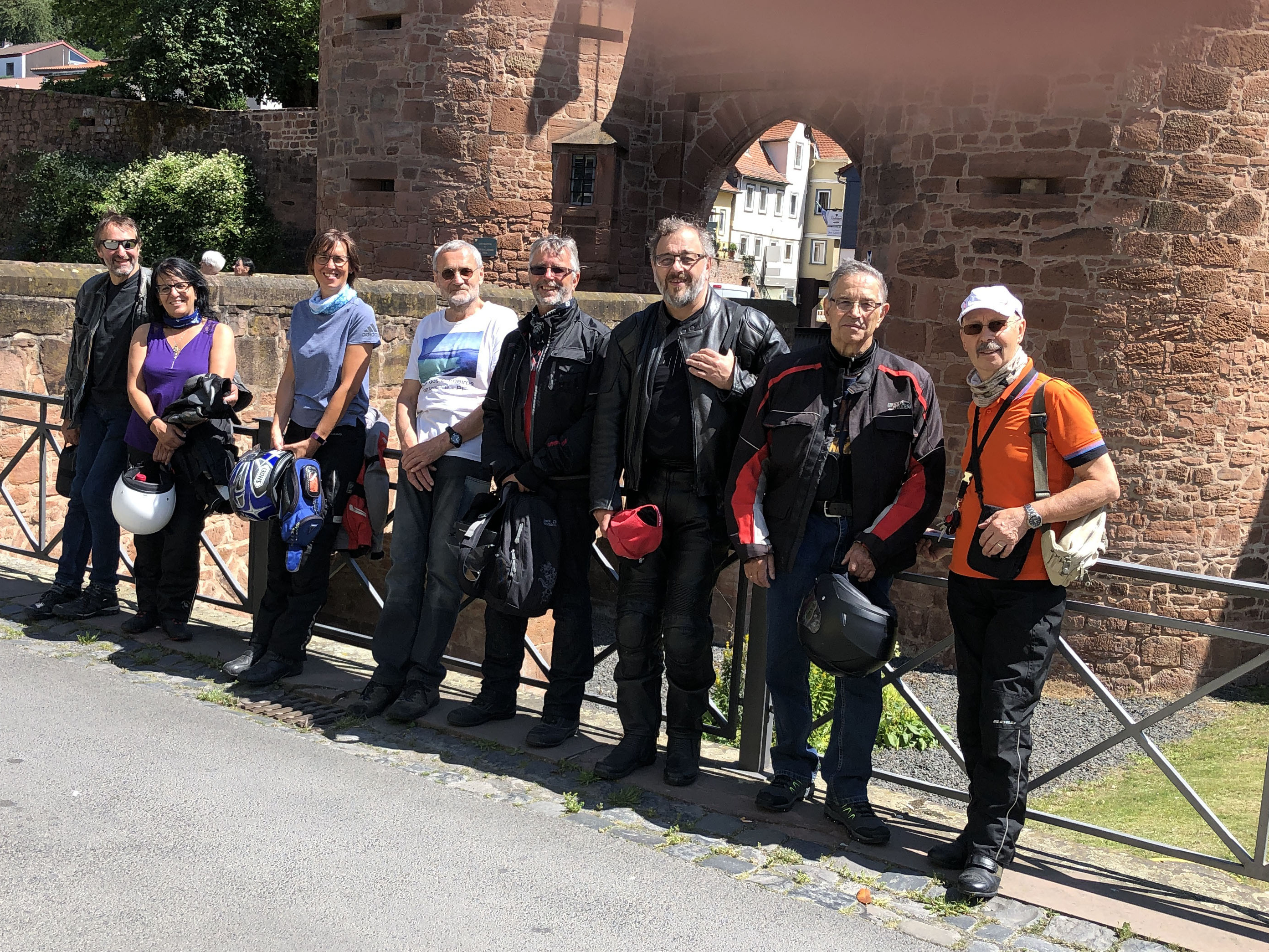 Beseelt von diesem frischen Mut, wurde die Tour Richtung Büdingen fortgesetzt. Zwischen Marienkirche und Schloss Büdingen konnten die Gruppe ihre Mopeds bequem abstellen, um zu Fuß die historische Altstadt kurz zu erkunden. Auch eine kleine Kaffeepause in einem Eiscafe war ein Muss, bevor noch ein Gruppenfoto am Jerusalemer Tor der Altstadt zur Erinnerung geschossen wurde.